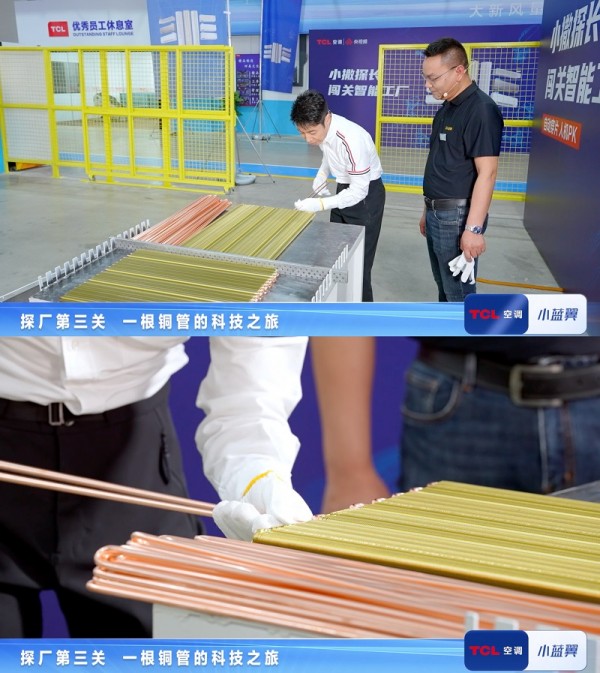 在AGV小车的指引下,小撒“探长”来到生产空调核心部件的两器车间,开启了“一根铜管的科技之旅”。在这里,一根根铜管都在经过切割、穿片、焊接等工序后,被加工成一个个空调的核心零部件。在自动穿片工序,小撒“探长”竟忍不住单挑自动化机器,但毫无意外这场“人机大战”还是以机器人的胜利告终。